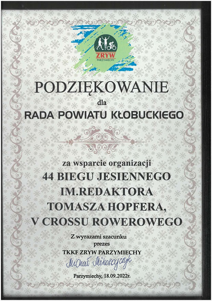 44 Bieg im. Redaktora Hopfera w Parzymiechach - podziękowania dla Rady Powiatu Kłobuckiego