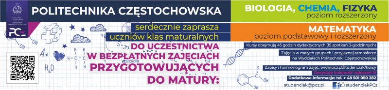 Politechnika Częstochowska zaprasza uczniów klas maturalnych do uczestnictwa w bezpłatnych kursach przygotowujących do matury z biologii, chemii, fizyki (poziom rozszerzony) oraz z matematyki (poziom podstawowy i rozszerzony).