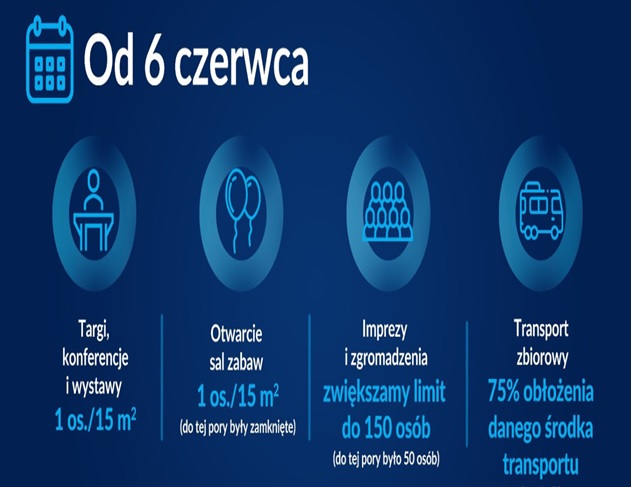 Coraz większa liczba osób zaszczepionych oraz odpowiedzialne zachowanie obywateli sprawia, że spada liczba chorych na COVID-19. Dzięki zadowalającej sytuacji epidemicznej w Polsce rząd luzuje kolejne obostrzenia. Od 6 czerwca możliwe będzie organizowanie wesel i zgromadzeń do 150 osób, a także targów i konferencji przy zachowaniu limitu – 1 osoba na 15 m2. Otwarte zostaną również sale zabaw dla dzieci.