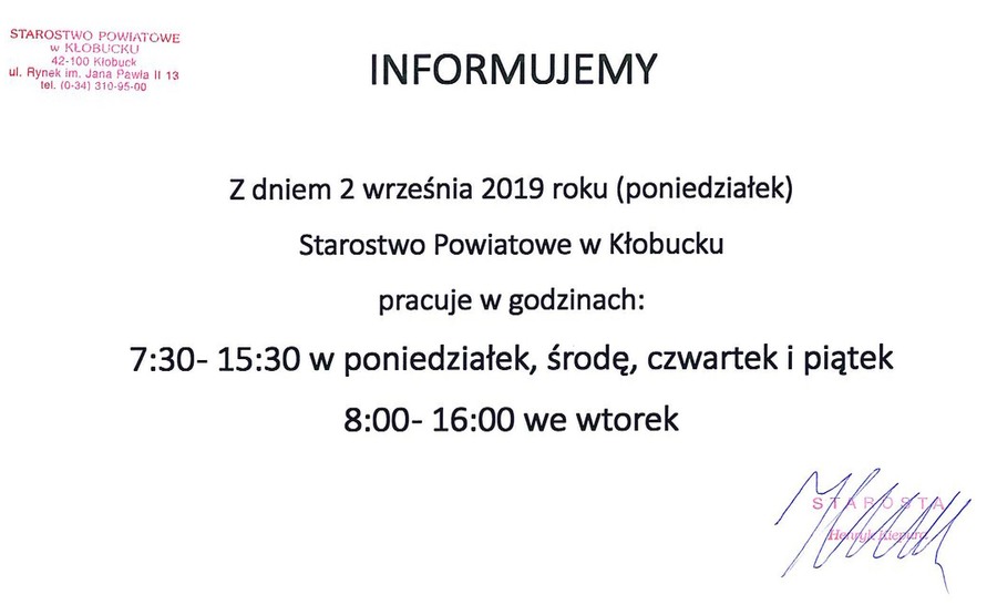 Godziny pracy Starostwa Powiatowego w Kłobucku od dnia 2 września 2019 roku