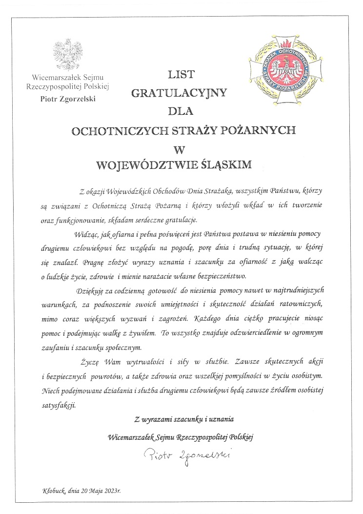 List gratulacyjny dla Ochotniczych Straży Pożarnych w Województwie Śląskim.
