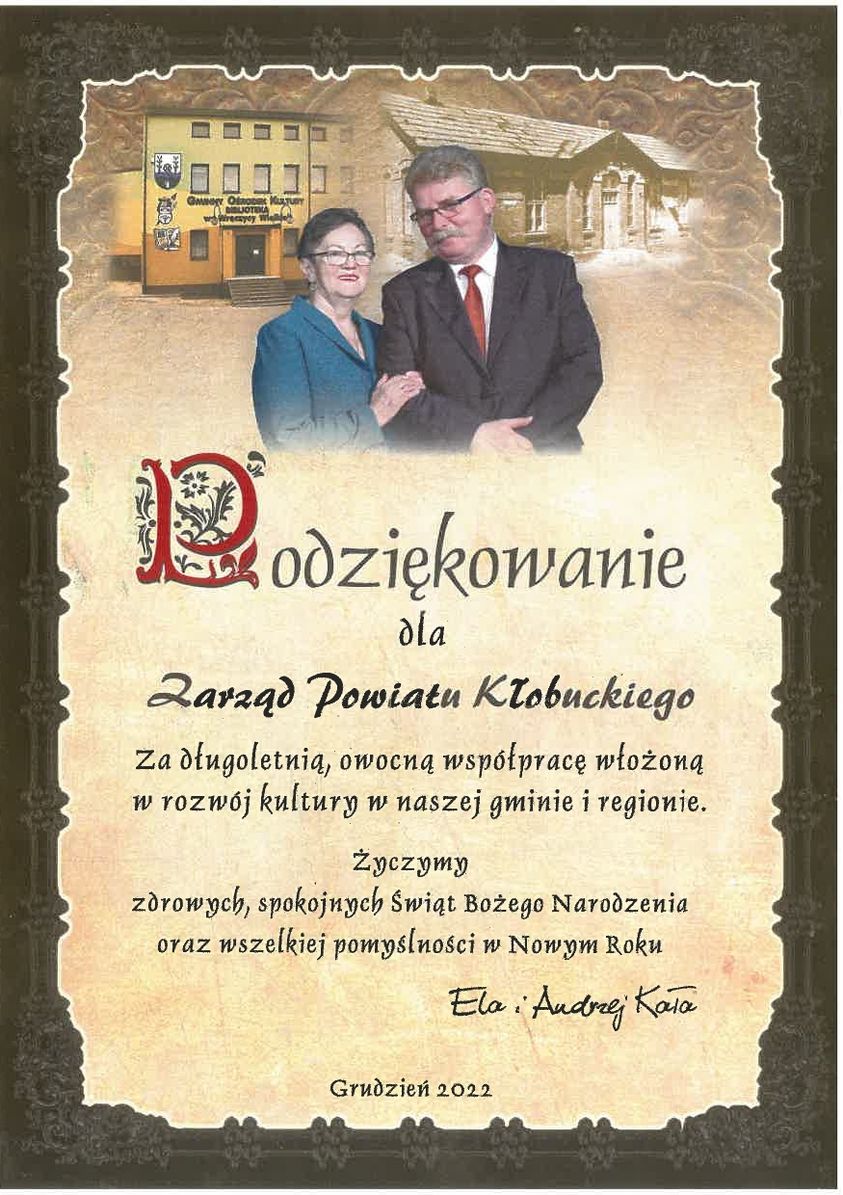 Wieloletni Dyrektor Gminnego Ośrodka Kultury we Wręczycy Wielkiej - Pan Andrzej Kała wraz z małżonką złozyli podziękowania dla Zarządu Powiatu Kłobuckiego za długotrwałą i owocną współpracę na rzecz rozwoju i promocji kultury ziemi kłobuckiej.
