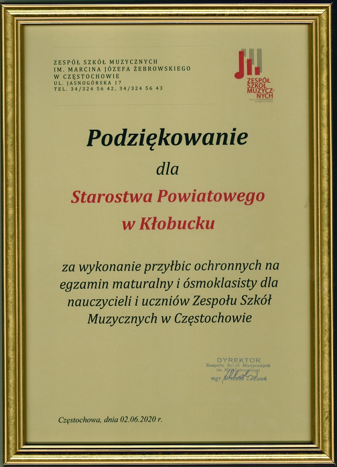 Podziękowania dla Starostwa Powiatowego od Zespołu Szkół Muzycznych w Częstochowie.