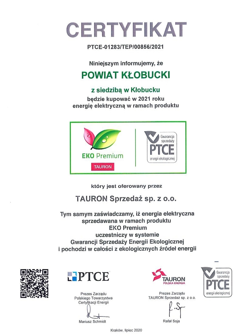 Dostawca energii dla Starostwa Powiatowego w Kłobucku przedstawił nam certyfikat potwierdzający pochodzenie energii ze źródeł ekologicznych.