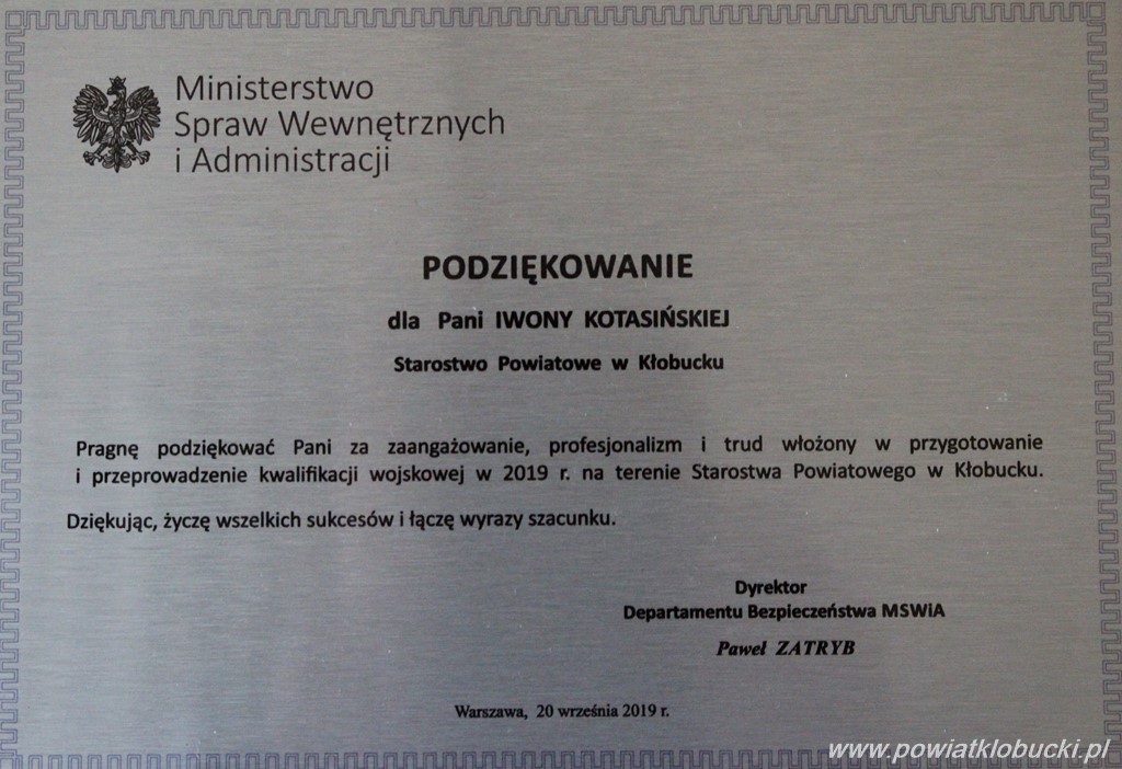 Iwona Kotasińska - Inspektor z Wydziału Spraw Obywatelskich i Zarządzania Kryzysowego, została wyróżniona przez Ministerstwo Obrony Narodowej pamiątkową tabliczką z gratulacjami, za wzorowo przeprowadzoną kwalifikację wojskową w naszym powiecie, w bieżącym roku.