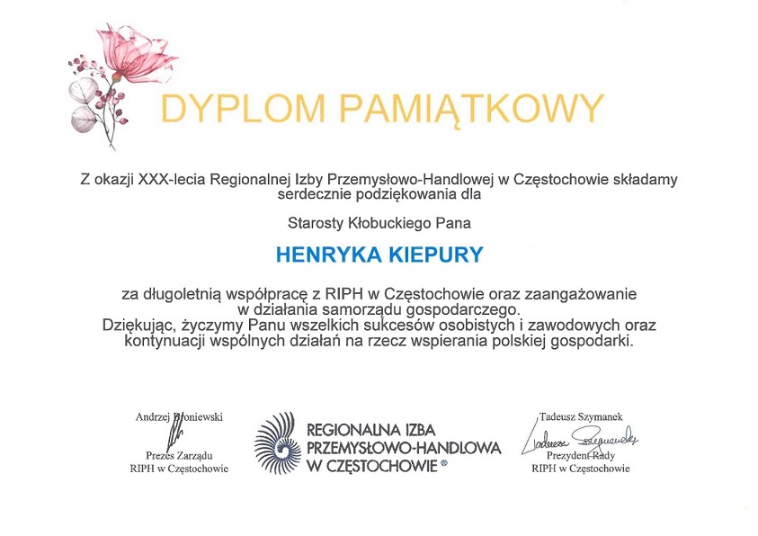 Podziękowanie dla Starosty Henryka Kiepury.