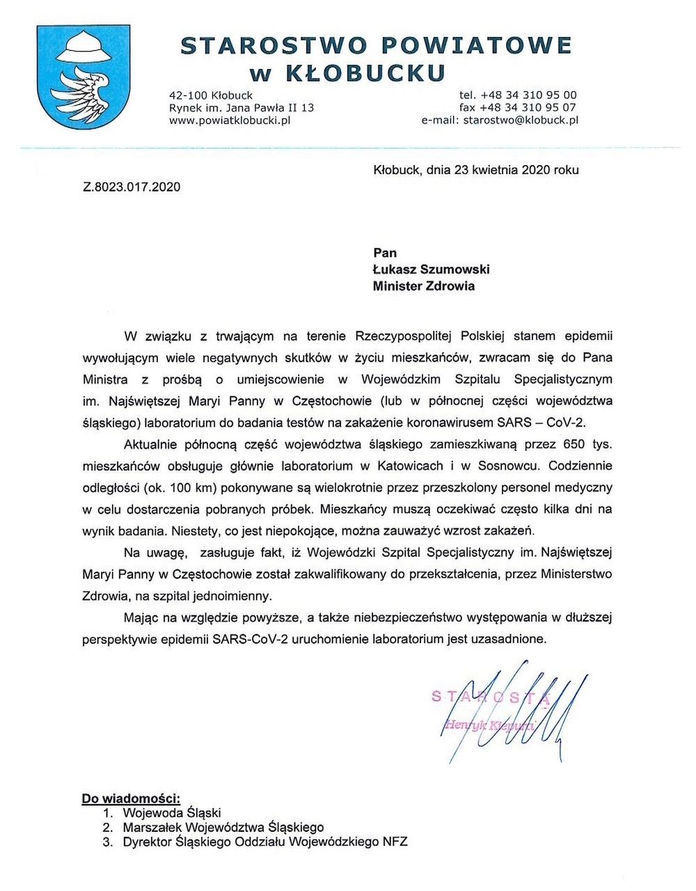 Poniżej zamieszczamy list Starosty Kłobuckiego, Pana Henryka Kiepury, który został przekazany do Ministra Zdrowia, Pana Łukasza Szumowskiego w sprawie utworzenia laboratorium do badania testów na zakażenie koronawirusem SARS-CoV-2.