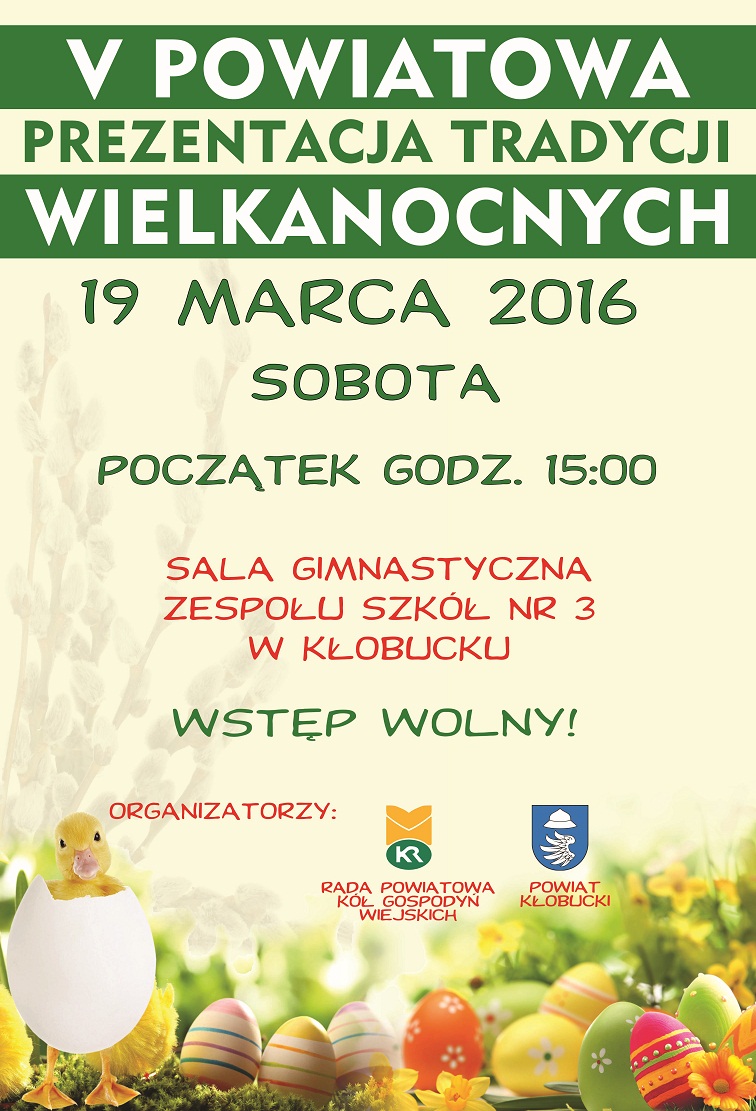 W dniu 19 marca 2016 roku (sobota) w sali gimnastycznej Zespołu szkół Nr 3 w Kłobucku przy ul. Ks. Skorupki 46, odbędzie się V Powiatowa Prezentacja Tradycji Wielkanocnych. Początek godz. 15.00.