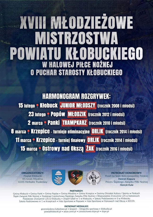 Już jutro (15 lutego) wystartują pierwsze rozgrywki z cyklu XVIII Młodzieżowych Mistrzostw Powiatu Kłobuckiego w Halowej Piłce Nożnej o Puchar Starosty Kłobuckiego!